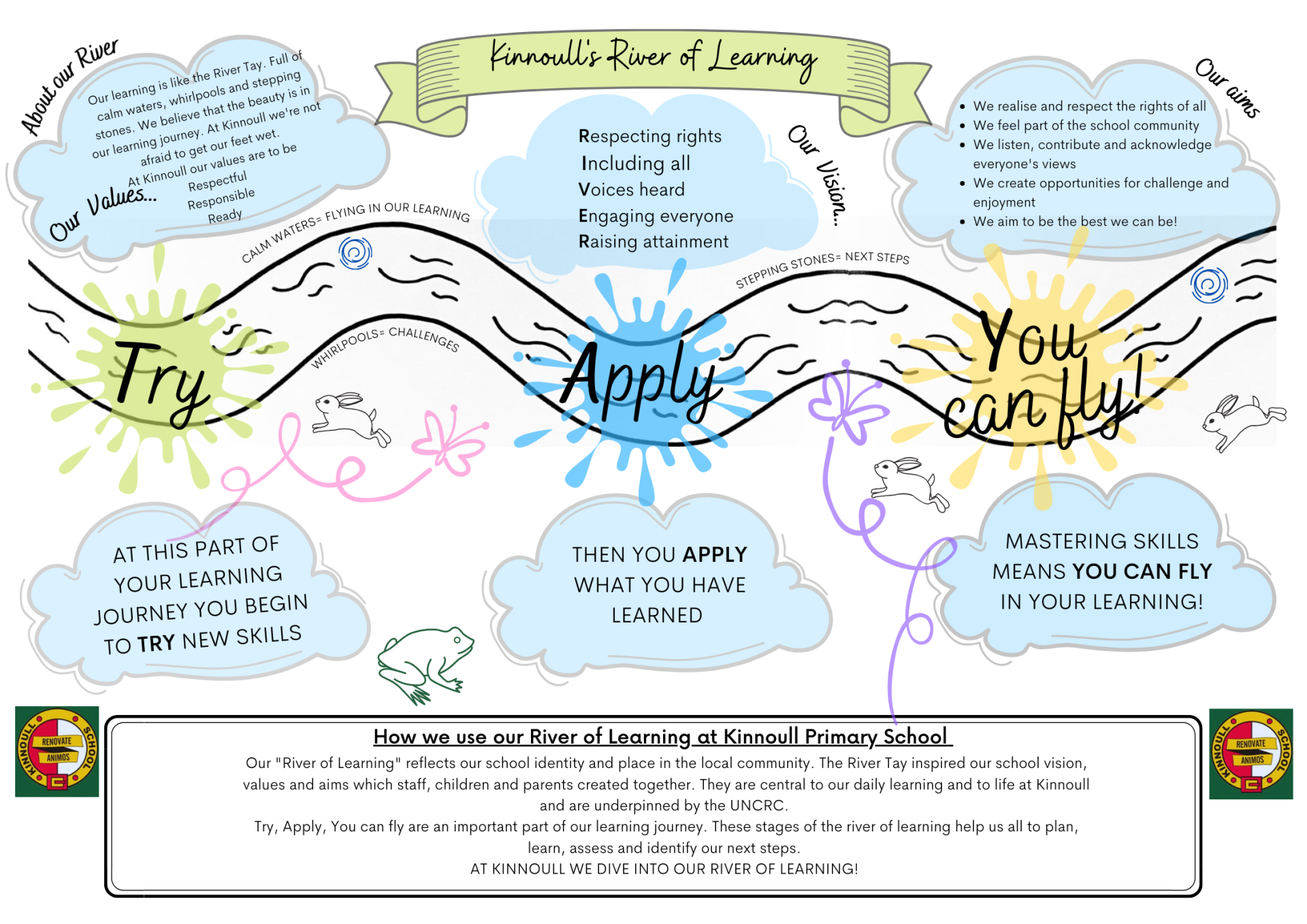 Our Vision, Values and Aims for our school are depicted within our "River of Learning". This reflects our school identity and our place within our local community as it is inspired by the River Tay. Staff, children and parents created this together and they have become central to our daily learning and to life at Kinnoull. The acronym TAY stands for Try, Apply, You can fly which represent important parts of our learning journey. These stages of the river of learning help us all to plan, learn, assess and identify our next steps.